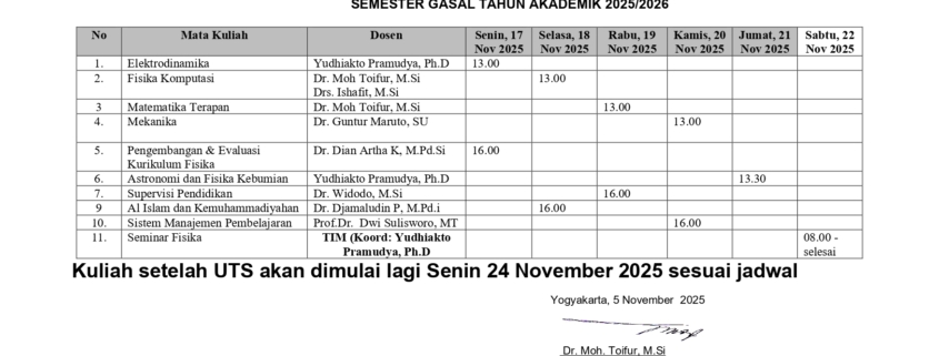 Tanggal 17 – 22 November 2025 dilaksanakan Ujian Tengah Semester. Jadwal ujian sudah disampaikan ke mahasiswa dan dosen 5 November 2025. Oleh karena itu dimohon kepada mahasiswa dapat menyiapkan diri sebaik-baiknya sehingga dapat sukses. Perlu diketahui UTS merupakan salah satu komponen evaluasi berbasis OBE. Untuk semester 2 kesuksesan di semester II dapat dijadikan pijakan untuk masuk ke tesis di semester III.