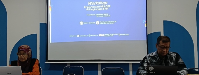Senin, 26 januari 2026 di Kampus 2B UAD (Gedung Ahmad Badawi) diselenggarakan Workshop Implementasi RPS OBE di Lingkungan FKIP di Ruang oleh LPP. Hadir dari LPP Prof. Dr. Ishafit, M.Si. dan Prof. Dr. Nanik Sulistiyani, Apt. kabid pengembang kurik LPP UAD.
